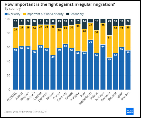 A recent Euronews poll found that fully 71% of respondents across Europe believe that strengthening border controls to combat irregular migration should be a priority in coming years, with the strongest support for such measures found in Poland (86%), Bulgaria (83%), and Finland (83%).