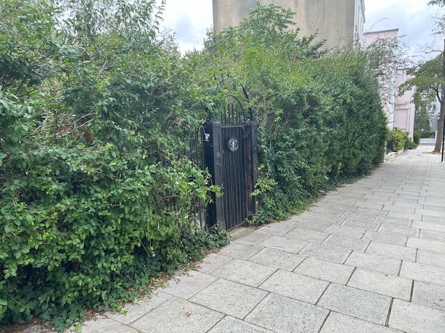 The imposing iron fence that William climbs to impress Anna that he, at least, isn’t intimidated by petty laws and regulations — the same laws and regulations I obey religiously in London — is daunting but also collapsing from the weight of greenery that covers most of it.