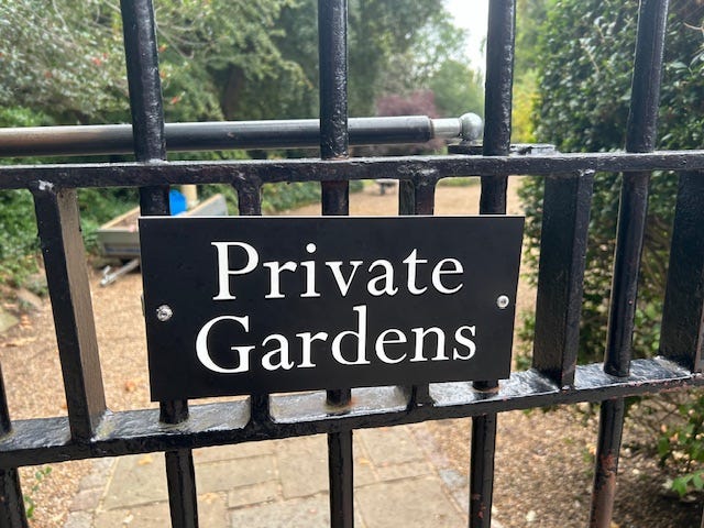 Even though you can’t get into them, a careful observer can see the gardens are pretty big, extending for what seems to be entire city blocks with rows of multi-million-pound townhouses sharing and protecting them.